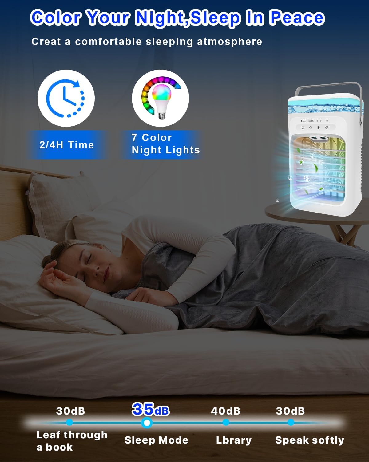 🌬️ 4-in-1 Portable Air Conditioner – This portable air conditioner is the ultimate multi-function device, combining a mini air conditioner, cooling fan, air cooler, and LED night light in one sleek, space-saving design. Featuring 2H/4H timer settings, you can easily adjust it to fit your cooling needs. Operating at a whisper-quiet 35dB or lower, it ensures you enjoy a peaceful environment for work, rest, or sleep. Perfect as an air conditioner for bedroom or any room in your home, offering both comfort and convenience